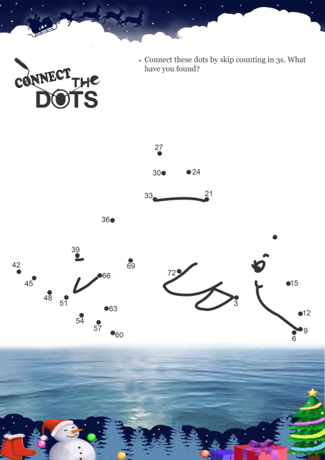 A painter has drawn a creature. After sometime he left with no colours. He went to the market to bring some new colours. Meanwhile some naughty boys came and rubbed his painting and left it with dots and numbers in a particular pattern written on them. When he came back he got very angry and don't know how to retrieve the picture back. Help him and find out what was he painting by skip counting in 3s.