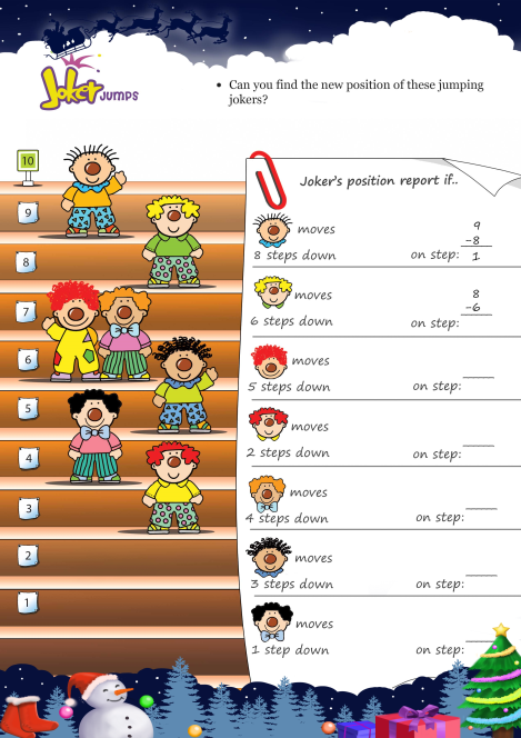 These jokers are practicing for their show in the circus. They are standing on the stairs marked from 1 to 10. Now some of them make large jumps and others make small jumps. Can you find out their new positions after they have made their jumps?