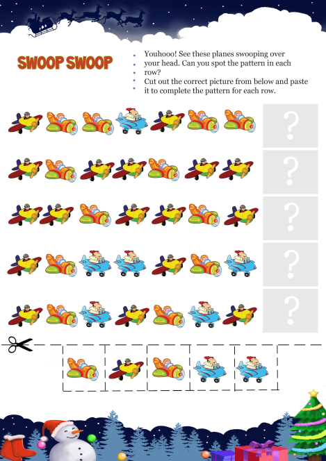 See these planes swooping over your head. Can you spot the pattern in each row? Cut out the correct picture from below and paste it to complete the pattern for each row.