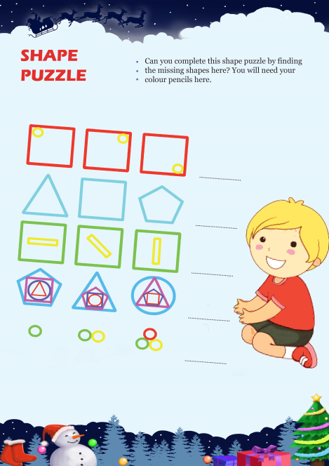 Ramu wants to complete a puzzle. Can you complete this shape puzzle by finding the missing shapes and help him? You will need your colour pencils here.