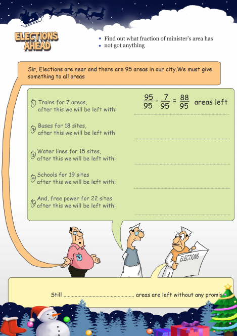 People of the city Kanpur are very disappointed about the bad roads,irregular water supply,electricity etc.One day a minister came for his propaganda.Then he promise to give something to all areas.But people does not trust him.Find out what fraction of minister`s area has got anything.