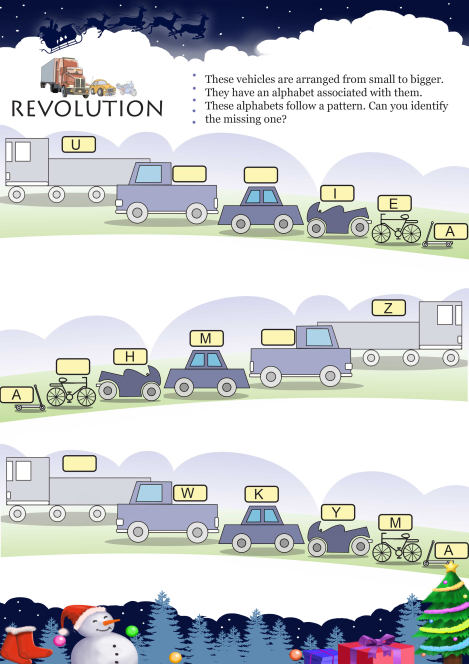 Some vehicles are arranged from small to bigger.They have an alphabet associated with them. These alphabets follow a pattern. Can you identify the missing one?
