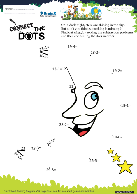 On a dark night,sky is full of shining stars.But something big is missing. Find out what by solving the subtraction problems and then connecting the dots in order.