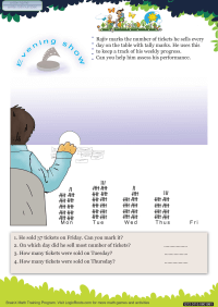 Rajiv marks the number of tickets he sells every day on the table with tally marks. He uses this to ...