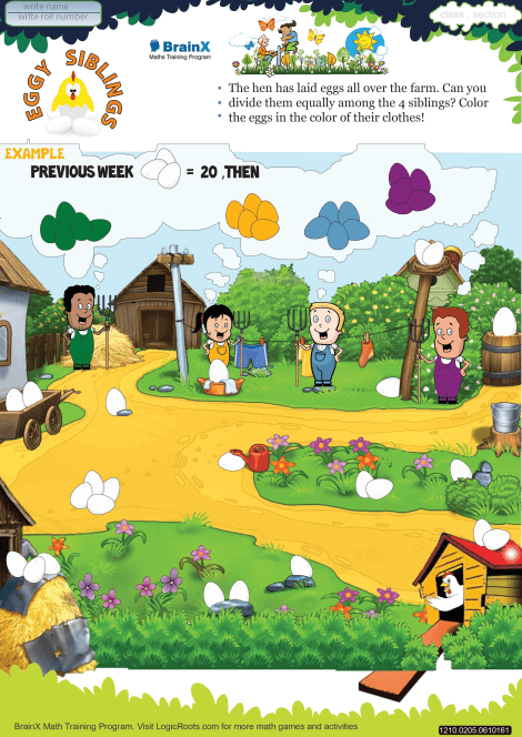 Once there lived a family, having 4 children named Bob, Sob, Tob and Rob. They also had a hen in their backyard. One week their family went out for an outing . When they came back, they saw that their hen had laid eggs all over the farm . Now all the siblings quarreled among themselves for the eggs. So, to tackle this they all decided to divide the eggs among themselves equally . Now first calculate the total number of eggs and divide among the 4 and color the eggs according to their T-shirt.