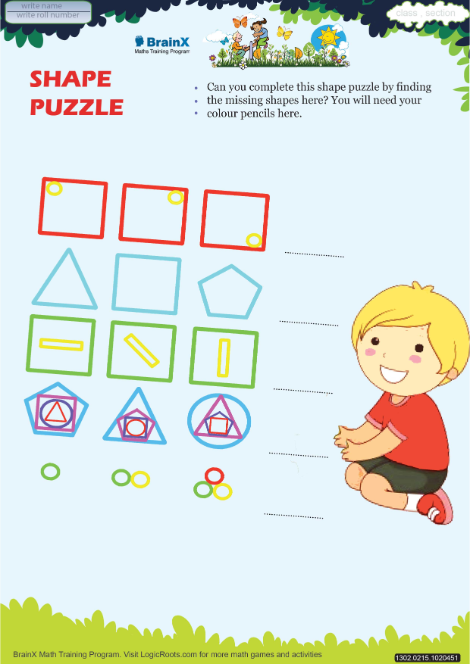 Ramu wants to complete a puzzle. Can you complete this shape puzzle by finding the missing shapes and help him? You will need your colour pencils here.