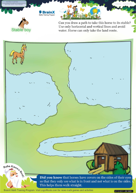 The horse 'Chetak' was roaming around his stable. But he has been lost in the jungle. He is very tensed. He don`t know the way to reach back. The condition is that the Chetak can take only the land route. Draw a path to take this horse to its stable using only horizontal and vertical lines while avoiding water.