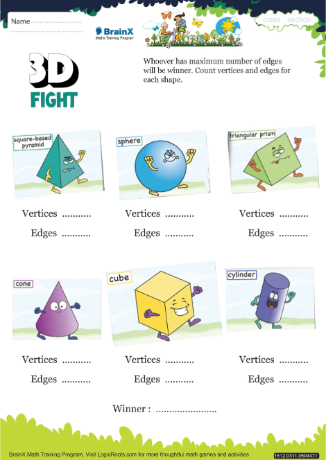 3D fight is on and you are the referee! You must guess the number of edges and vertices. The shape with the highest number of edges and vertices wins the 3D fight. Game on!