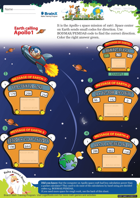 In 1967, the Apollo space mission was launched. A spaceship was sent to space for conducting studies. In outer space, it gets difficult to find your way. So scientists from Earth sent small signals to the astronauts. There are 3 possible answers for each. Use the rules of BODMAS/PEMDAS to find the correct direction.