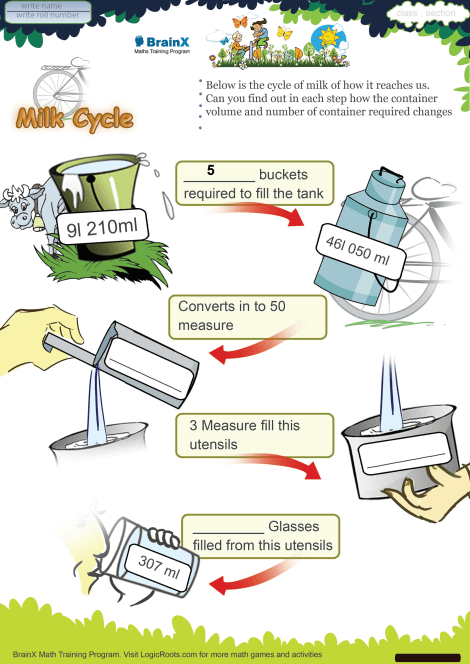 The milk takes a long journey before it comes to you in a glass in the morning. The cow gives milk. The milkman collects milk from several cows and puts it in cans. These cans come to the city and finally to your home to your mother. Your mother heats the milk and then gives you in a glass. Can you find out the volume of each container