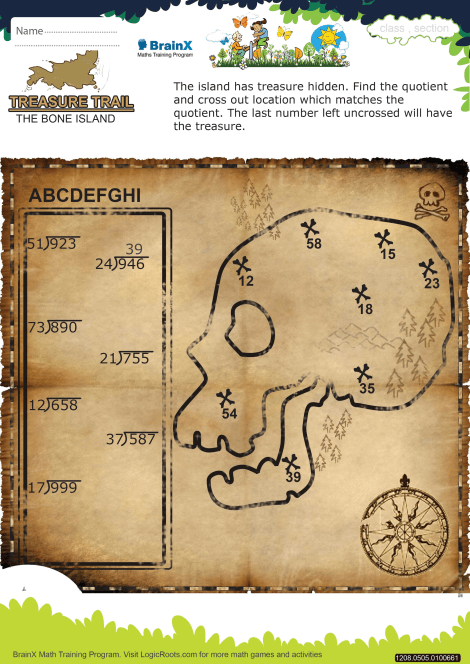A pirate set on a mission to raid the treasure on the Bone Island. He has a map of the island and some clues written next to it. A wise old man once told him to be cautious of the solutions of the clues, those locations may contain a hidden mine. So, help the pirate to solve the clues and cross out all those locations which come out in the quotient. The remaining one should contain the treasure chest.